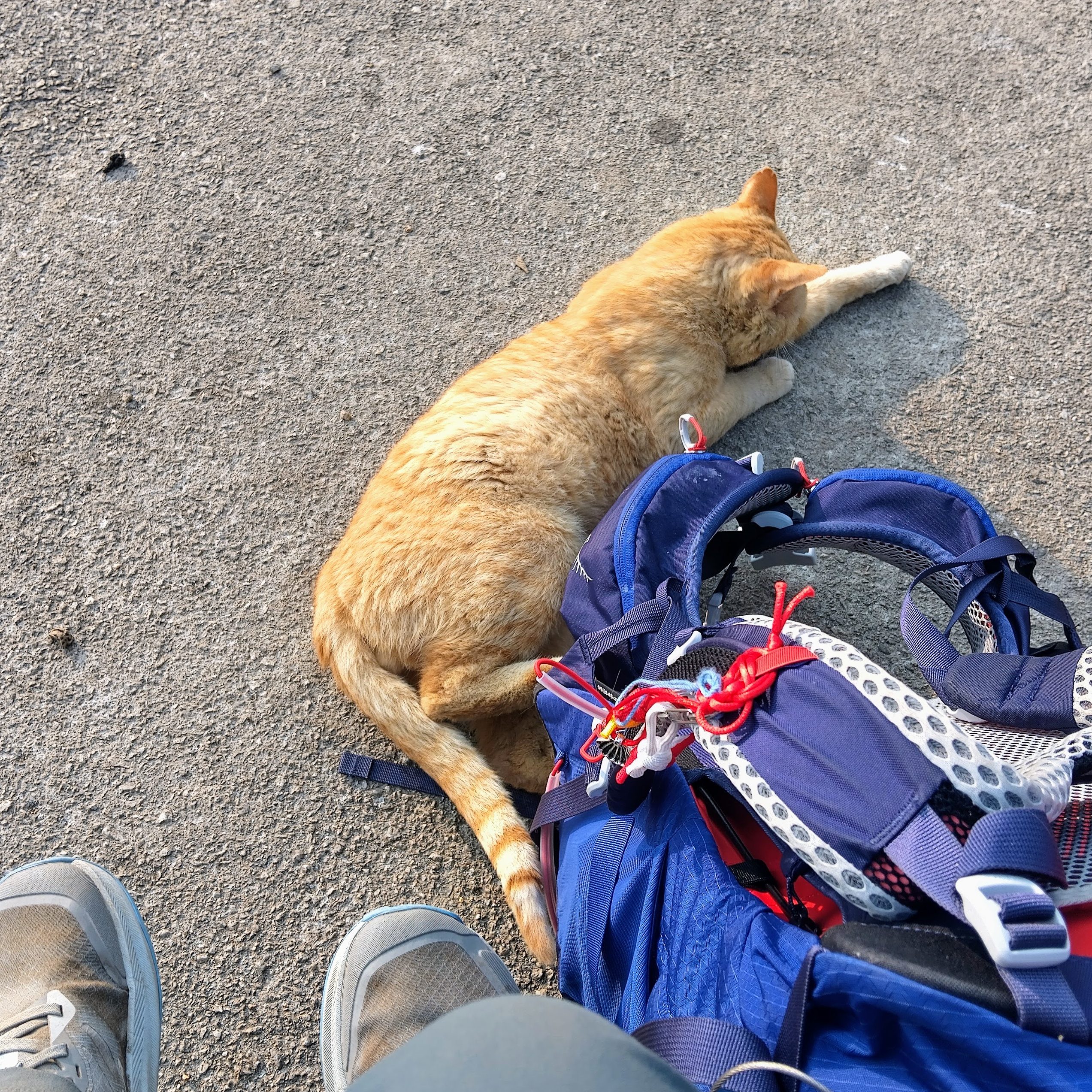 There was nowhere to stop for food, but luckily I still had the other half of my box of biscuits. When I stopped to snack, a new friend tried to hitch a ride in my backpack.